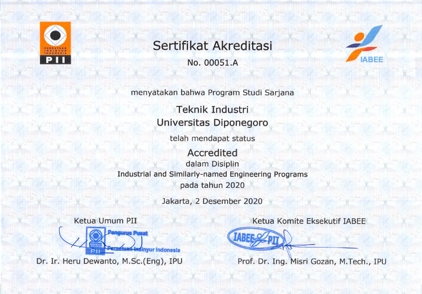 Status Akreditasi Internasional: GA(General Accreditation) (2018-2024) dari The Indonesian Accreditation Board for Engineering Education (IABEE) dengan Sertifikat Akreditasi No. 00051.A.